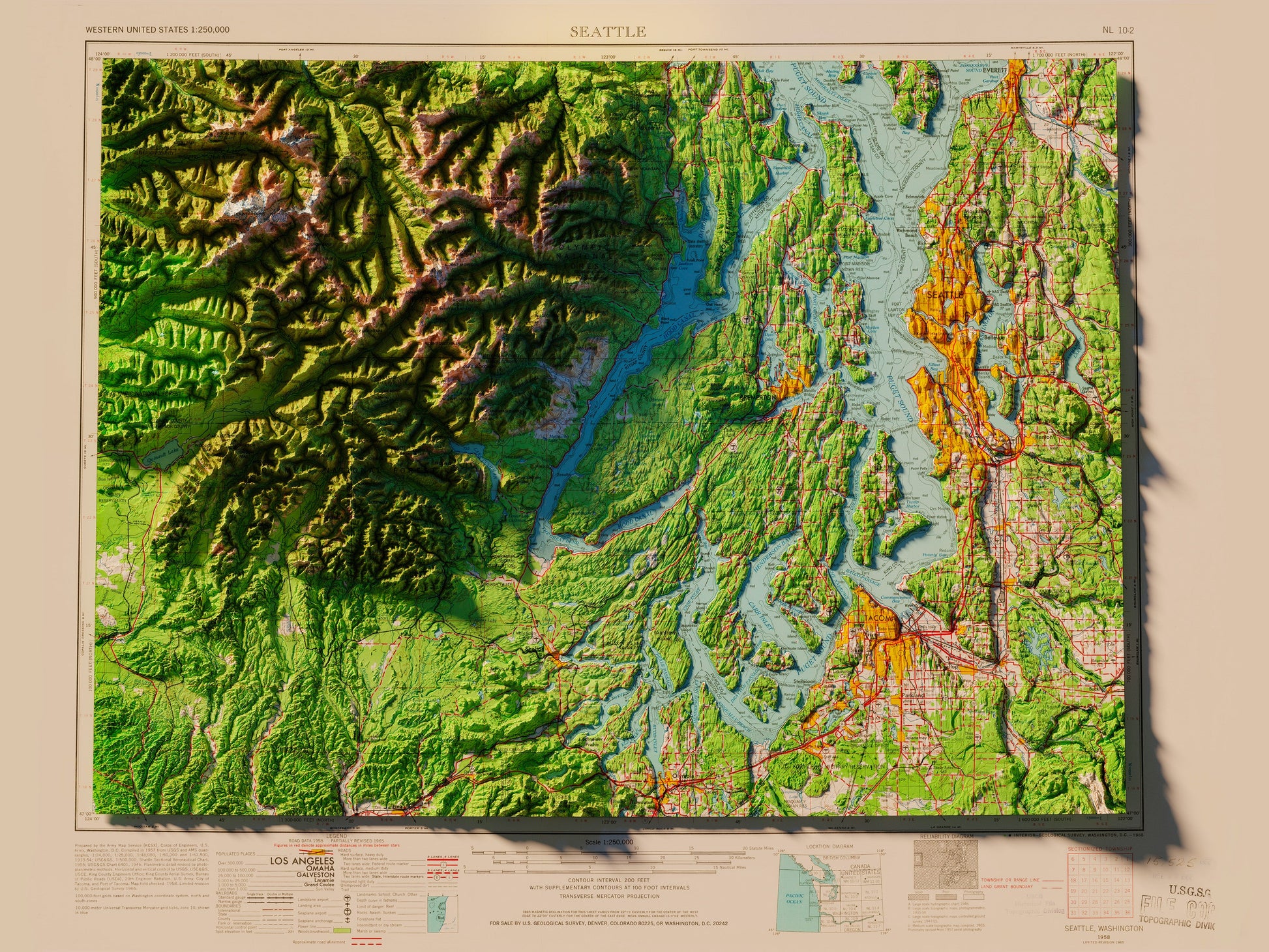 Seattle, Washington shaded relief topo map Thomas Wyse Forestry